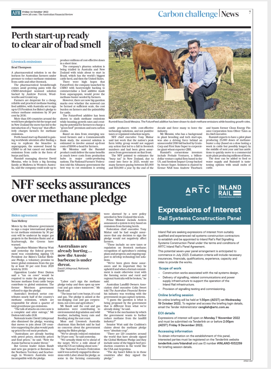 ALOA CEO Colin Sweet was today quoted in the Financial Review regarding moves by the Albanese government to sign a major international pledge to cut methane emissions by 30%
